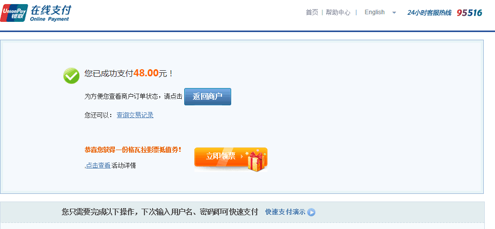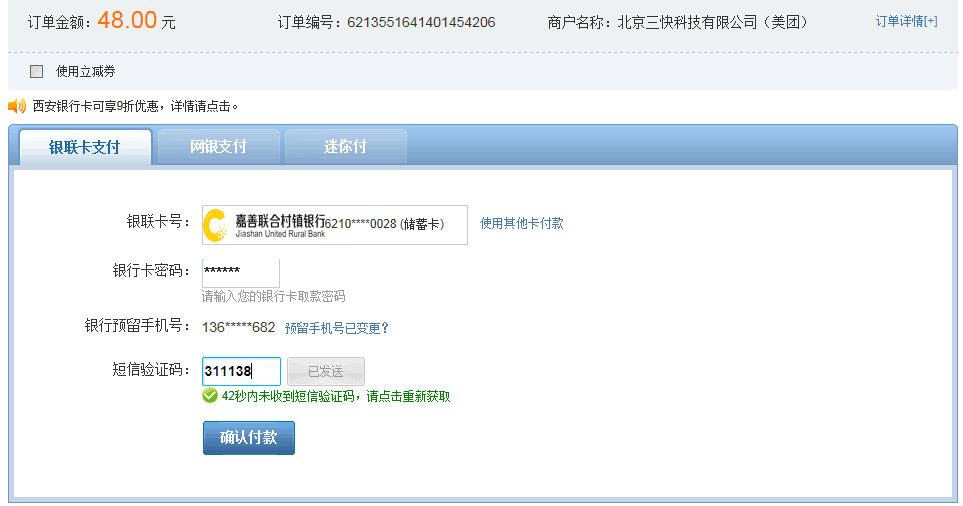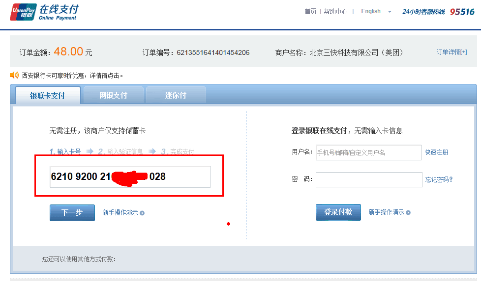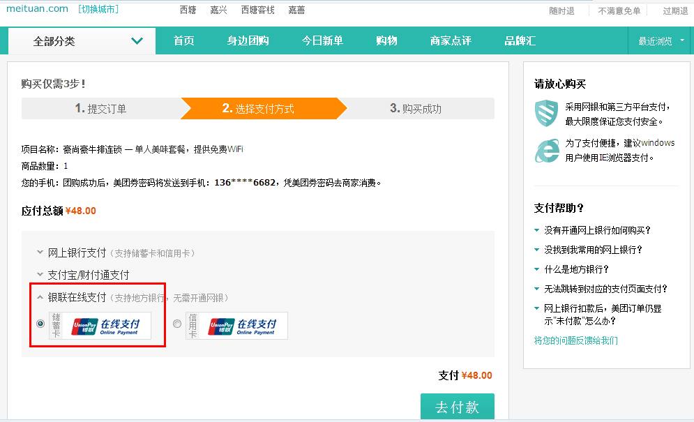 银联在线支付功能是一种广泛应用的互联网支付结息渠道,如12306火车票购票网站、美团网、一号店。现以美团网为例,演示如下: