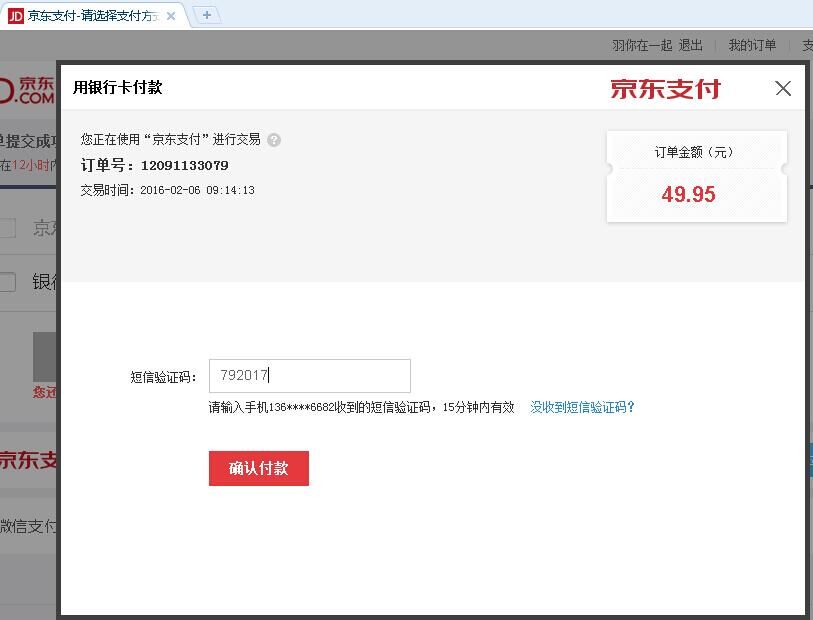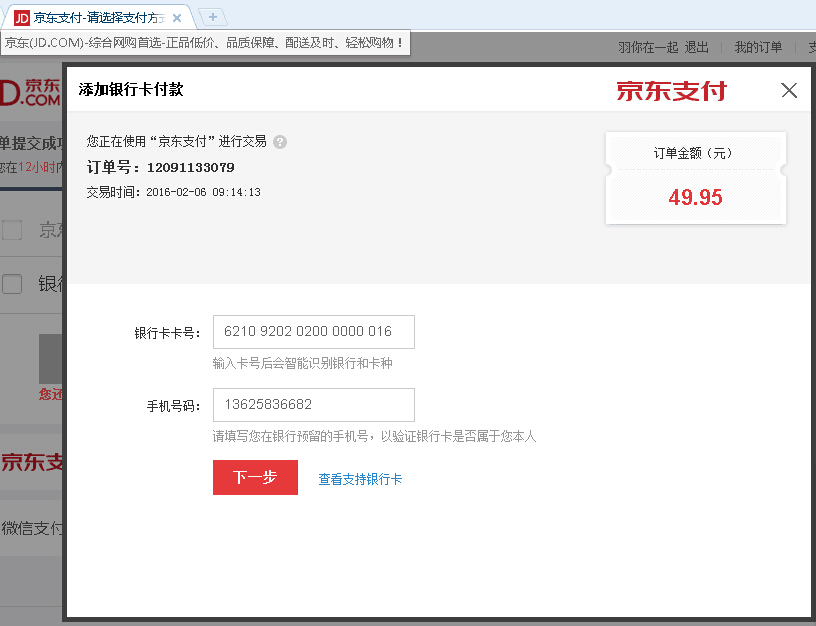 我行联合卡于2016年2月初开通京东支付功能,该功能支持在京东商城购物时,只要付款方式中选择“京东支付”,就可以选择该方式完成在线支付(类似于支付宝功能)。“京东支付”时,只要输入联合卡的卡号和验证要素(手机号码和短信验证码),就能完成在线支付。