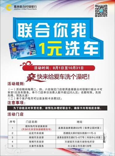 为进一步加强特惠商户建设,促进我行银行卡业务的稳步发展,2016年8月-9月,我行在全行范围内开展了“1元洗车”银行卡营销活动。通过区域分析,我行选择了五家洗车店选为本次活动的特惠商户,总行营业部、大舜支行、微型金融部、天凝支行、大云支行分别设为责任单位相对应开展活动。我行所有联合卡持卡客户在以上五家洗车店内洗车刷卡只收1元。为增加宣传力度,我行还通过微信等渠道发送活动信息,活动参加人数稳步上升。活动开展以来,由于客户好评如潮,因此,我行提升服务的便民力度,对活动时间、频率等作了调整:活动时间延长1个月,客户每月只能刷卡消费1次变为3次,洗车店每周四、周六可以进行活动改为每周二、周四、周六均可享受洗车服务。目前,该活动还在火热进行中,平均每周有63人次参与活动,且每周的参与都有上升,活动的影响力正在不断扩大。