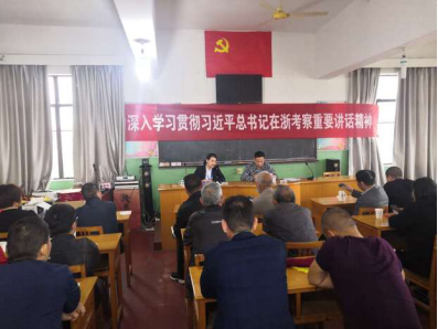 会议上首先学习了习近平总书记在浙考察重要讲话精神:3月29日至4月1日,习近平在浙江省委书记车俊和省长袁家军陪同下,先后来到宁波、湖州、杭州等地,深入港口、企业、农村、生态湿地等,就统筹推进新冠肺炎疫情防控和经济社会发展工作进行调研。强调要全面贯彻党中央各项决策部署,做好统筹推进新冠肺炎疫情防控和经济社会发展工作,坚持稳中求进工作总基调,坚持新发展理念,坚持以“八八战略”为统领,干在实处、走在前列、勇立潮头,精准落实疫情防控和复工复产各项举措,奋力实现今年经济社会发展目标任务,努力成为新时代全面展示中国特色社会主义制度优越性的重要窗口。总书记的重要讲话为我们战胜疫情、走出困境提振了信心、鼓舞了士气,为我们深化改革、持续发展指明了前进方向,提供了根本遵循。通过认真学习习近平总书记的重要讲话内容,深刻领会蕴含其中的丰富内涵和精神实质,切实把思想和行动统一到讲话精神上来。站在“两个维护”的政治高度,围绕新目标新定位,干在实处、走在前列、勇立潮头,确保总书记的殷殷嘱托落地生根、开花结果。