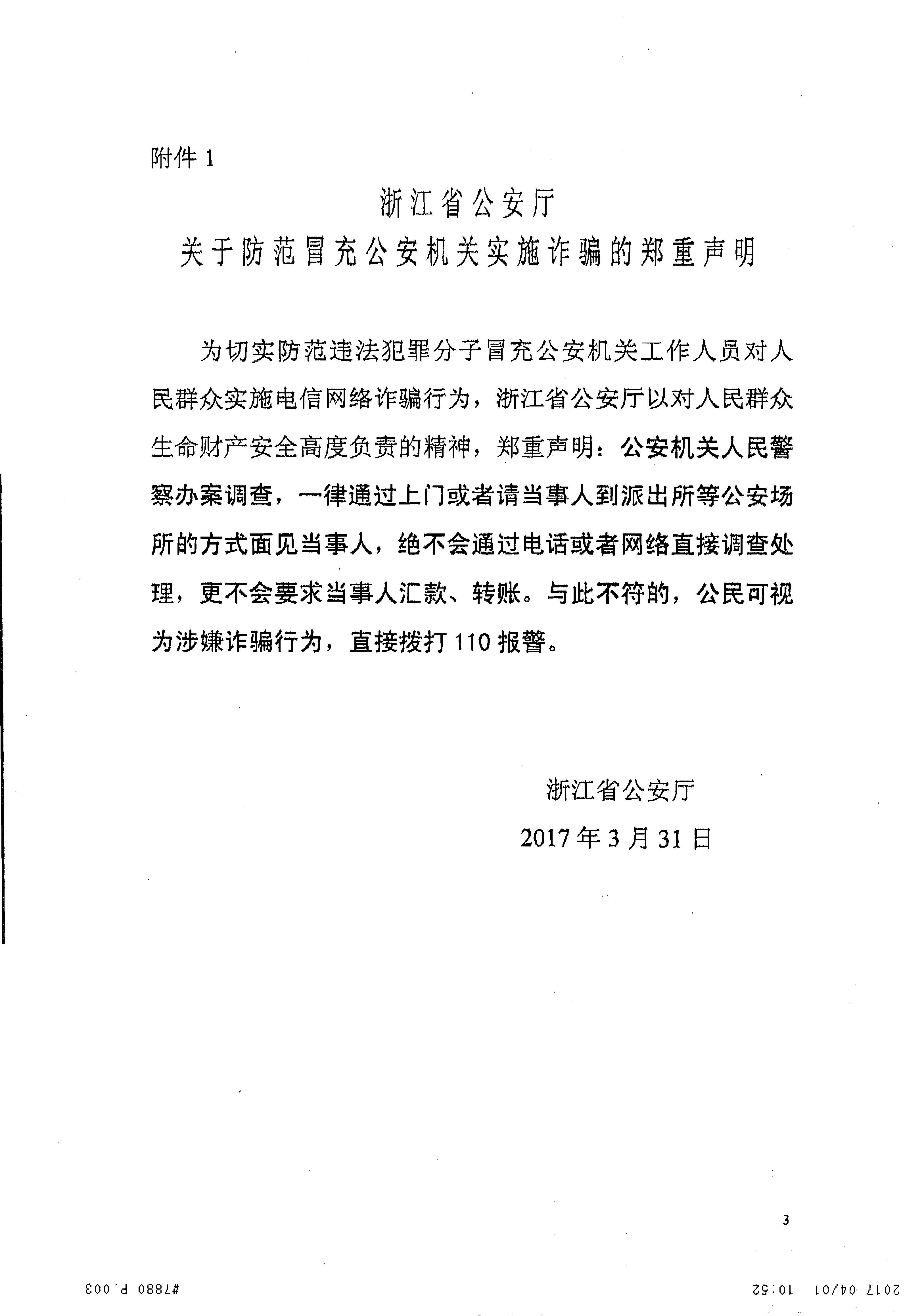 浙江省公安厅关于防范冒充公安机关实施诈骗的郑重声明