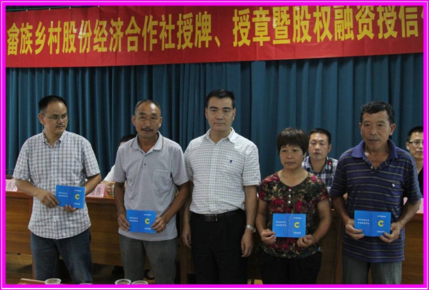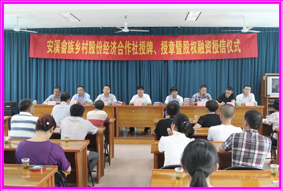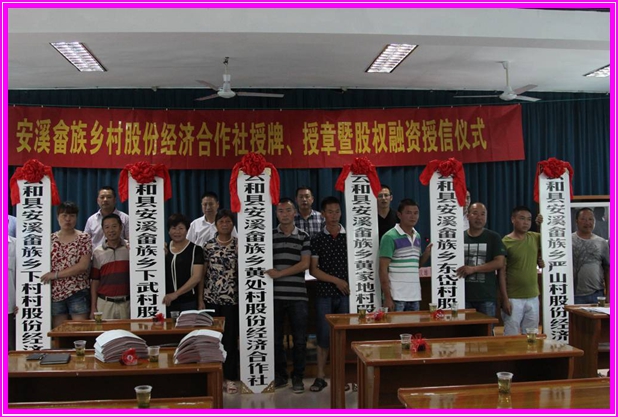 2014年7月25日,安溪畲族乡村股份经济合作社授牌、授章暨股权融资授信仪式在安溪畲族乡三楼会议室隆重举行,出席会议的有副县长叶晓伟、农业局局长杨克法、人行副行长彭秋伟、联合村镇银行行长刘剑龙以及扶贫办、兴农担保公司领导。参加会议的还有安溪畲族乡各村村委书记、村委主任、部分股权授信代表等50余人参加了会议,会议由安溪畲族乡乡长雷汉雄主持。